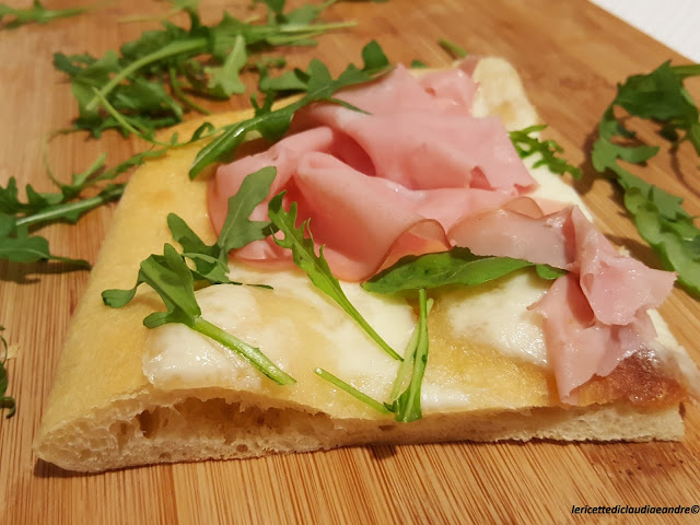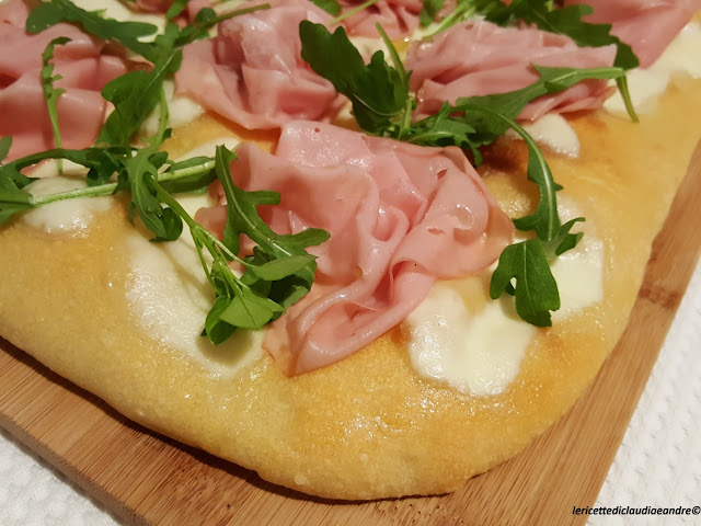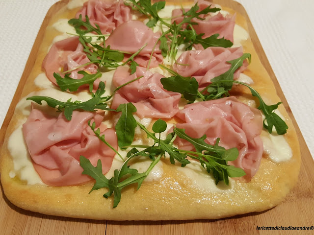 - Togliere la teglia dal forno, distribuire anche la mortadella, della rucola a piacere, io ne ho messo sopra poca perché non piace a tutti, ma dopo abbiamo abbondato.