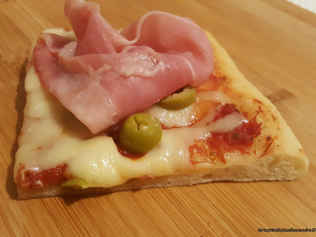 Pizza con semola di grano duro, emmental, olive, prosciutto e lievito madre