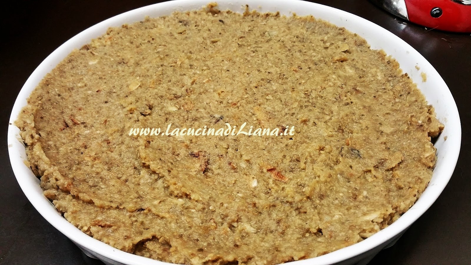 Sbucciare le melanzane, tagliarle a fette e infornarle a 200 ° ventilato per 30 minuti. Frullarle e mescolare a pangrattato, uovo e parmigiano, insaporire con aglio in polvere, sale e peperoncino.