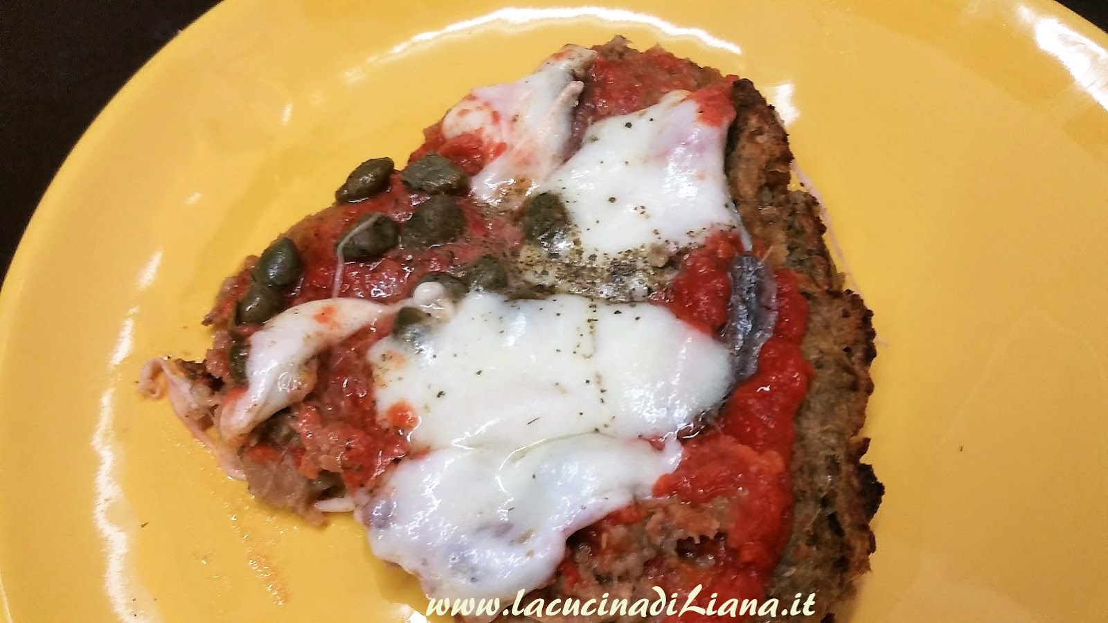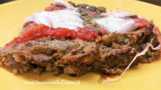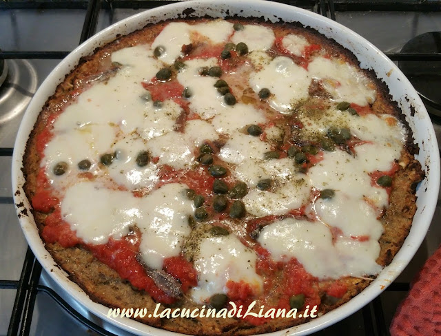 Dopo lafinta pizza di Cavolfiore ecco la pizza di Melanzane, francamente molto più buona. Al posto dell’impasto della pizza, un composto di melanzane cotte al forno e frullate, mescolate a formaggio, pangrattato e spezie e poi condita come più vi piace: io l’ho condita come una pizza Napoli: con pomodoro, mozzarella, acciughe e capperi.