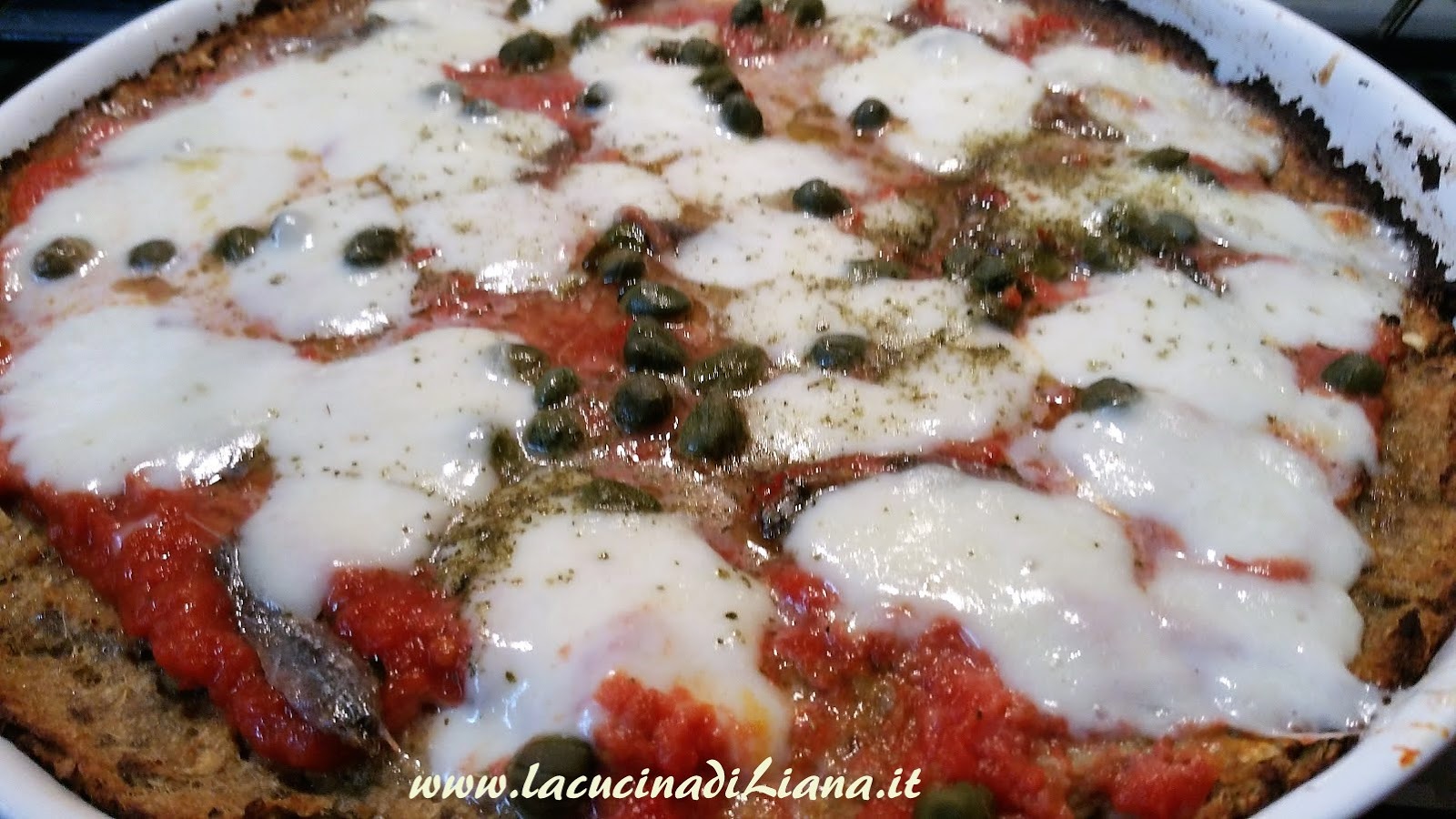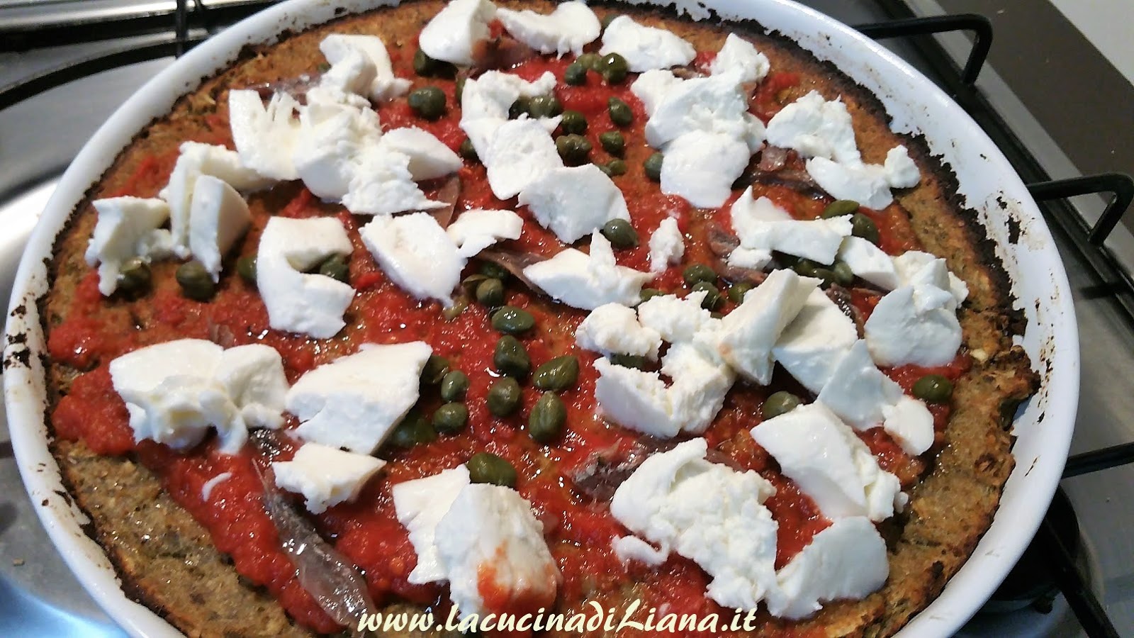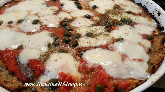 Ungere una teglia o foderarla di carta forno e livellare il composto ,quindi infornarlo ventilato a 200° per 20 minuti. Estrarre la pizza e condirla con il pomodoro, la mozzarella, le acciughe i capperi e l’origano e reinfornare per 5 minuti.