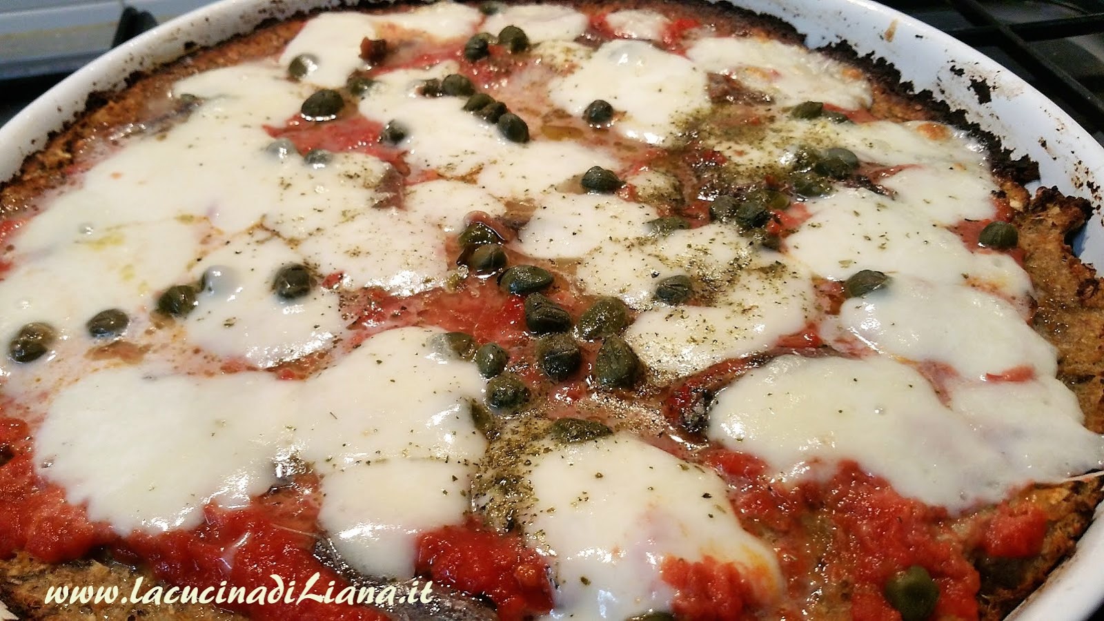 Dopo lafinta pizza di Cavolfiore ecco la pizza di Melanzane, francamente molto più buona. Al posto dell’impasto della pizza, un composto di melanzane cotte al forno e frullate, mescolate a formaggio, pangrattato e spezie e poi condita come più vi piace: io l’ho condita come una pizza Napoli: con pomodoro, mozzarella, acciughe e capperi.
