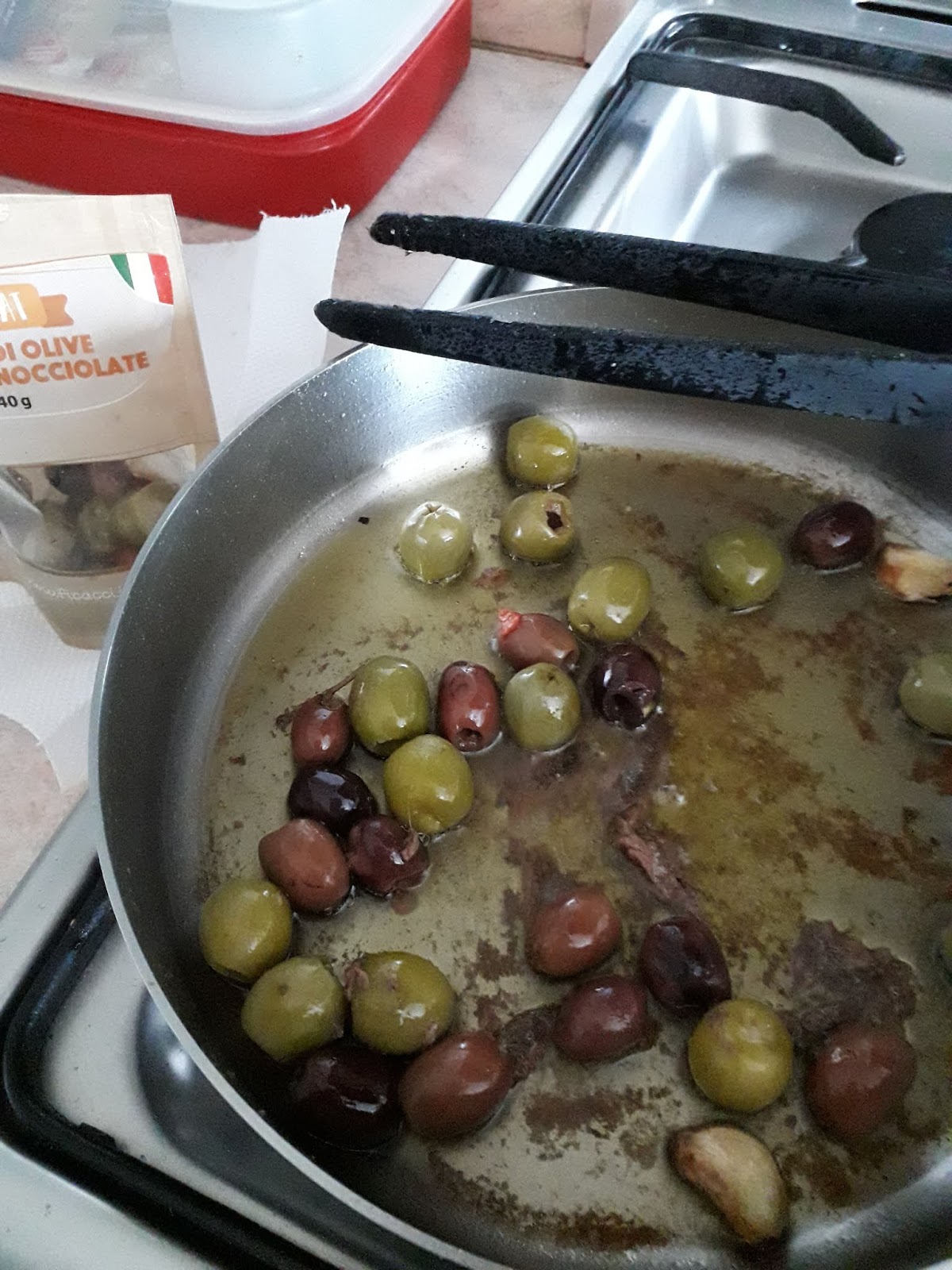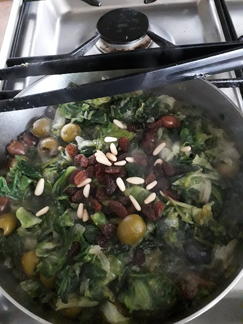 e uniamo le olive,le scarole,i pinoli e l’uvetta,saliamo e terminiamo la cottura.!