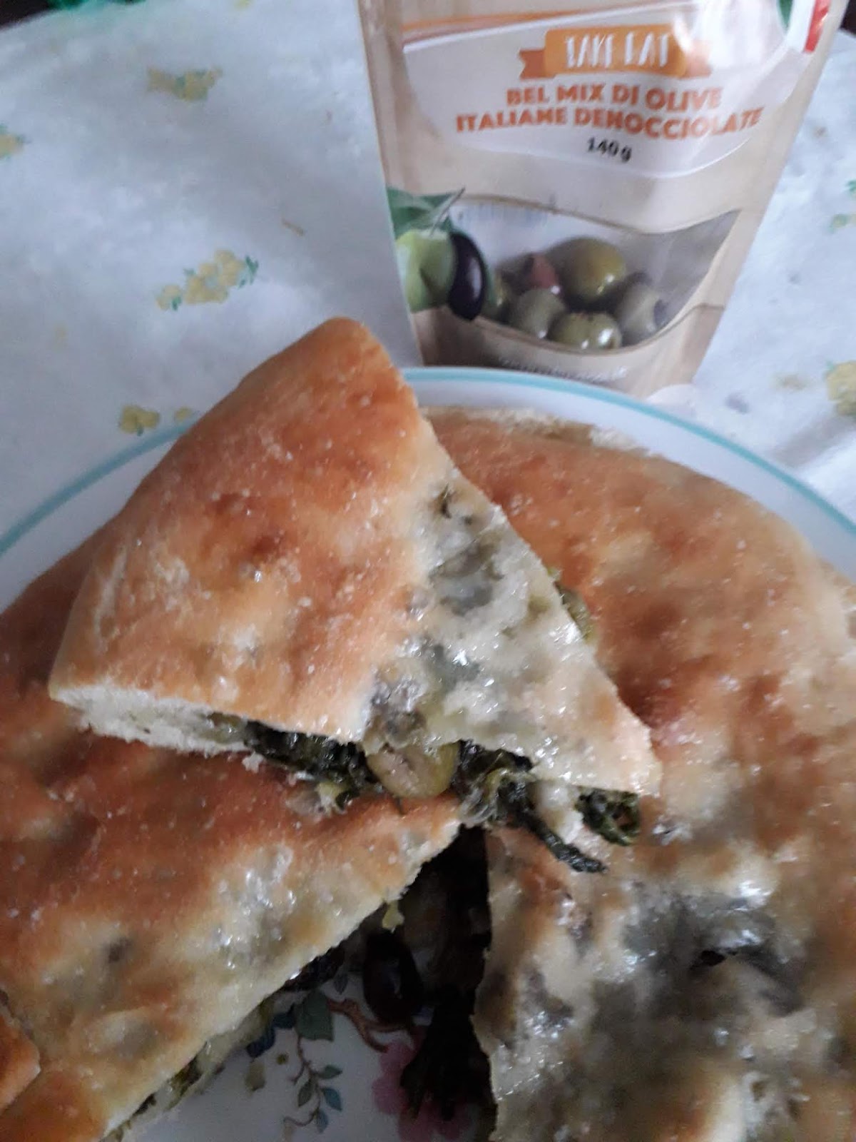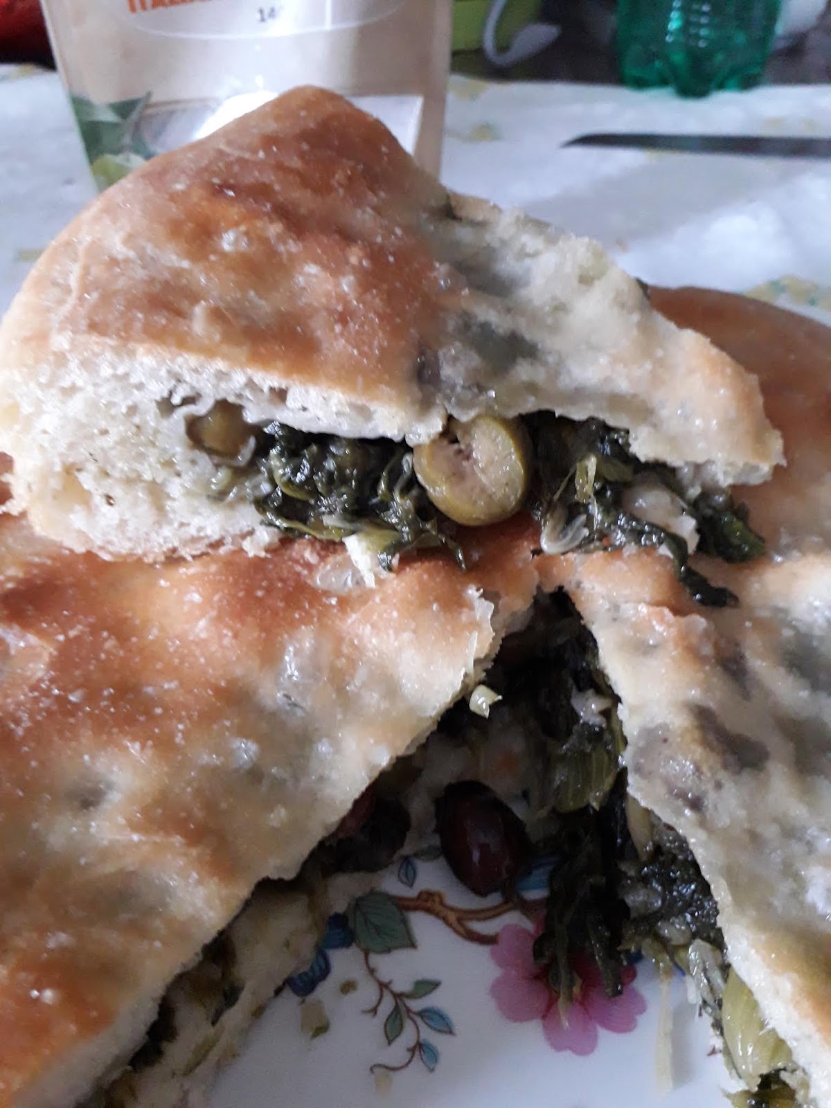 Stendiamo in una teglia oleata, la parte piu’ grande d’impasto,farciamo con le scarole