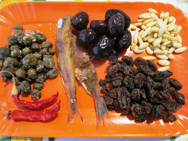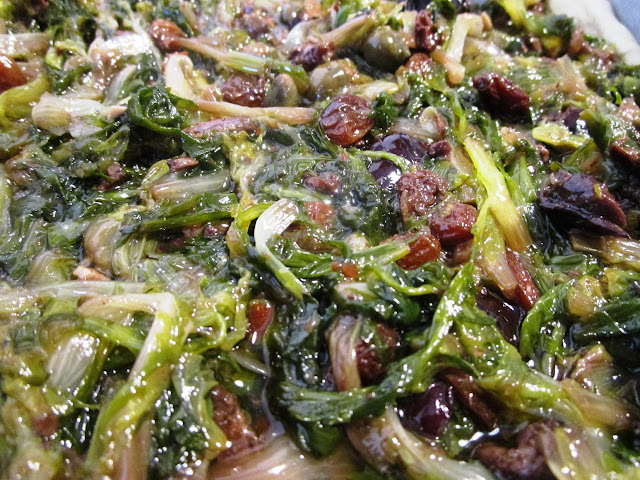 Io la preferisco con la scarola riccia (indivia) anche se si può utilizzare la scarola liscia (detta napoletana) perchè adoro il gusto lievemente amarostico di questa verdura e il contrasto con il dolce dell’uva passa, i pinoli , il gusto delle olive nere di Gaeta (io olive nere siciliane) .