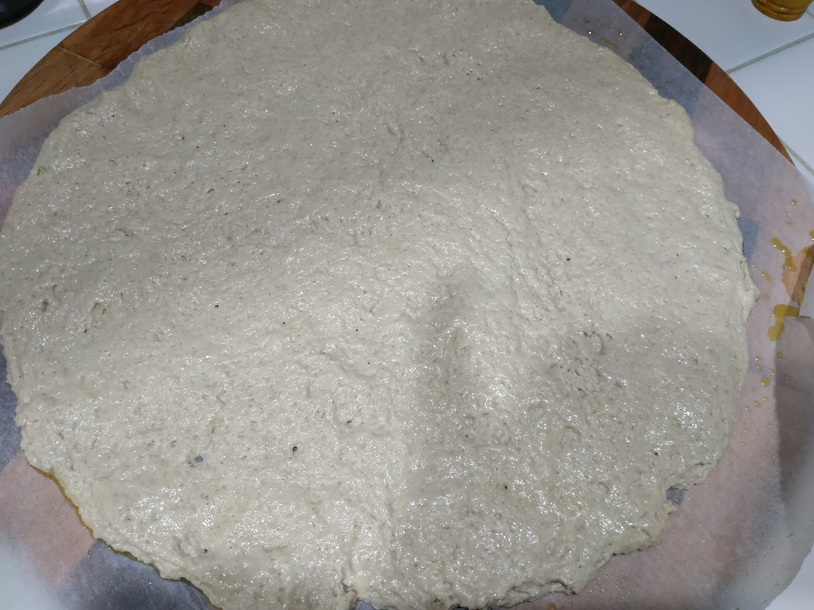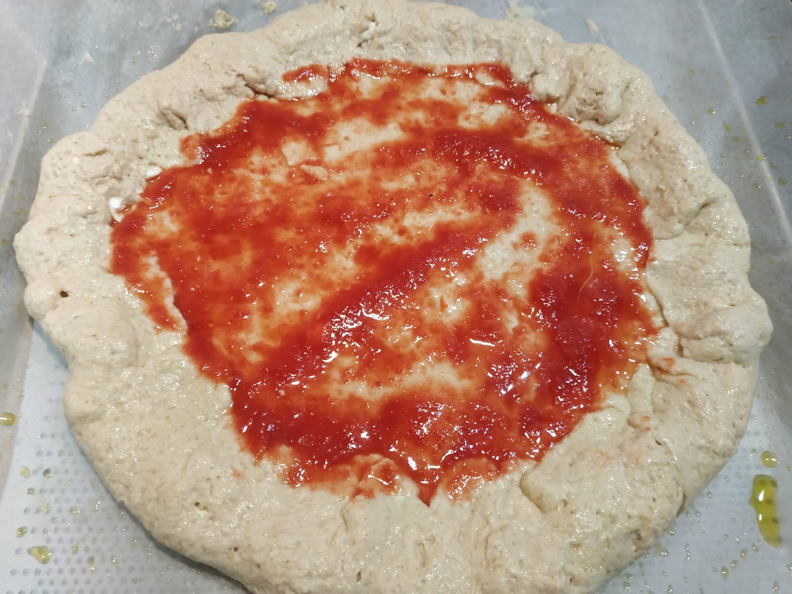 L’impasto avrà una idratazione del 70% perchè questa farina assorbe molta acqua. 500 g di semola di Timilia, 350 g di acqua, 150 g di pasta madre (oppure 5 g di lievito di birra), 20 g di sale, due cucchiai di olio extravergine d’oliva. Impastate il tutto e fate lievitare fino al raddoppio. Prendere quindi l’impasto con le mani leggermente unte e stenderlo su una teglia a forma circolare.