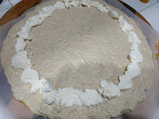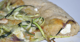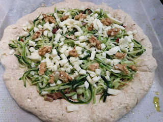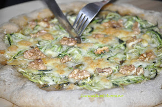 Con i condimenti potete spaziare come volete: io vi mostrerò i miei: 250 g di ricotta, 2 zucchine, qualche foglia di radicchio, 100 g di provola dolce, qualche cucchiaiata di passata di pomodoro, gherigli di noci, olio extravergine d’oliva, origano, pepe nero. Sistemate con un cucchiaio la ricotta sulla corona circolare della pizza.