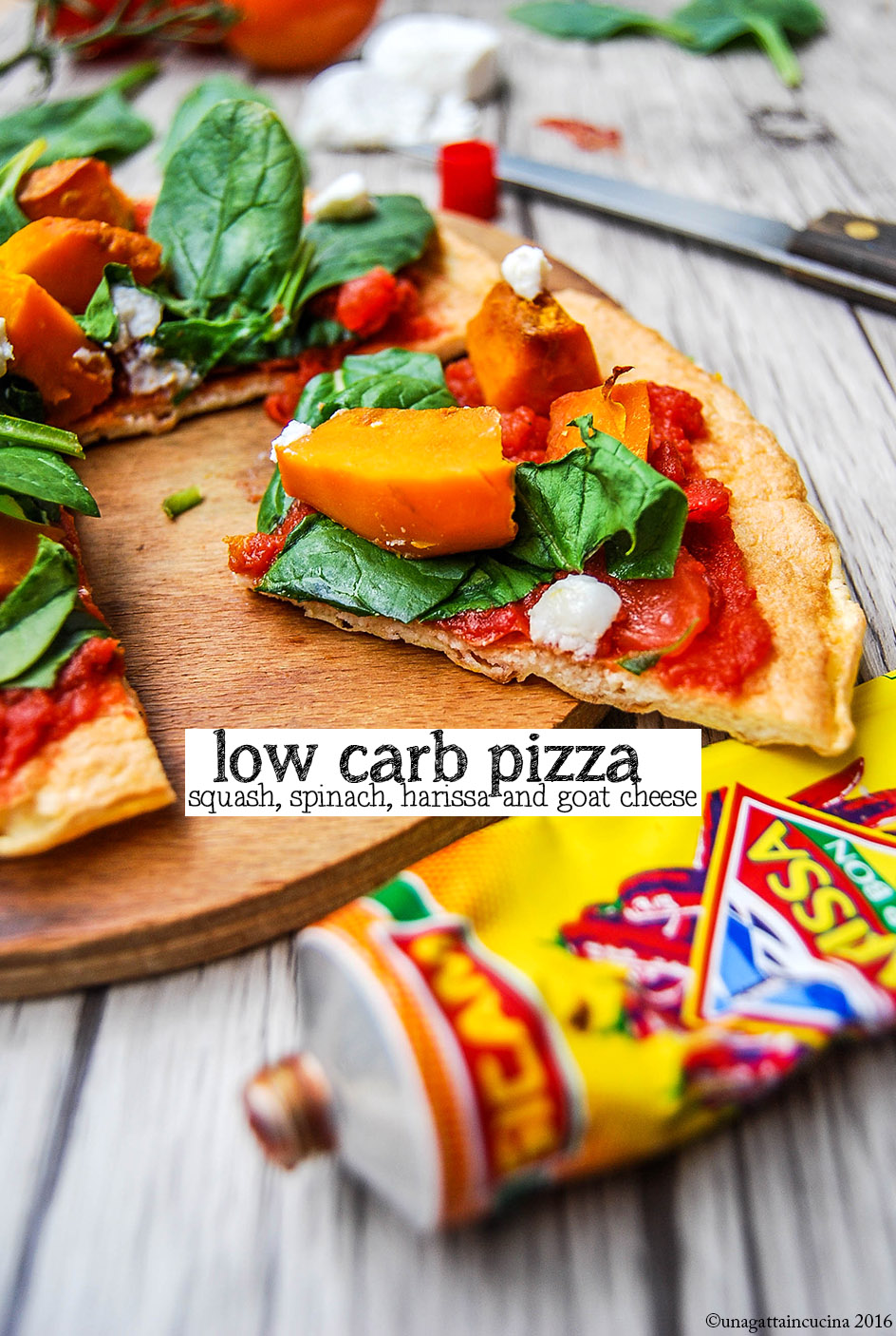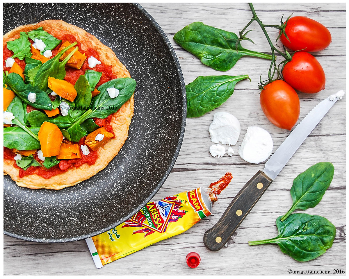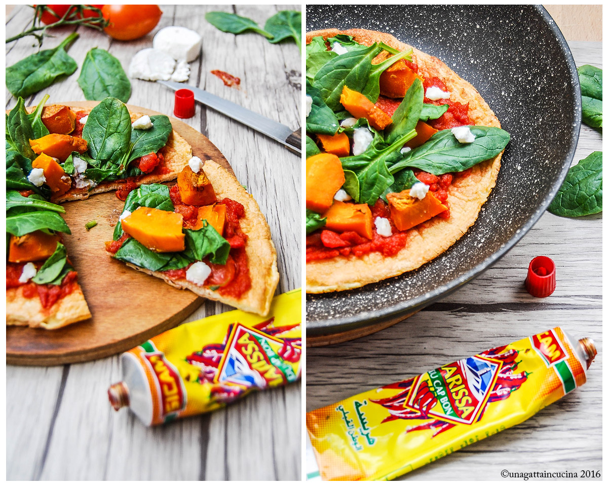 Mix the tomato saucewith harissa, adjust salt, if necessary Spread it over the pizza and top with half squash, spinach, and goat cheese.