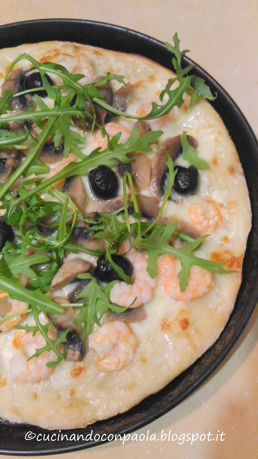 Farcite le pizze con la mozzarella, le code di gambero, le olive nere scolate e lavate, i funghi affettati fini, l’olio d’oliva, il sale e pepe. Infornate a 230°C per 8 minuti e completate alla fine con la rucola; condite ancora con poco olio e sale. Servite la pizza ben calda.