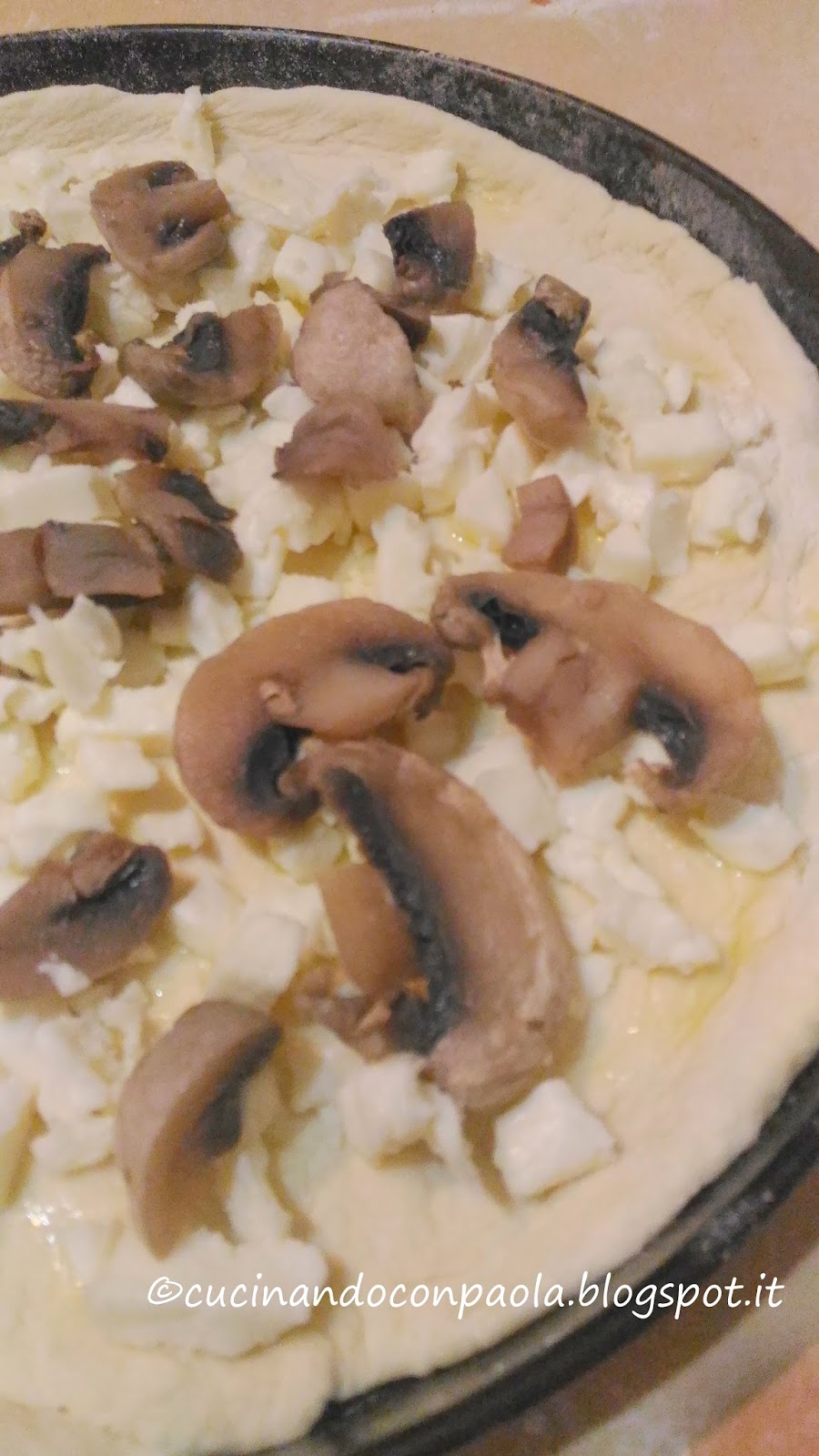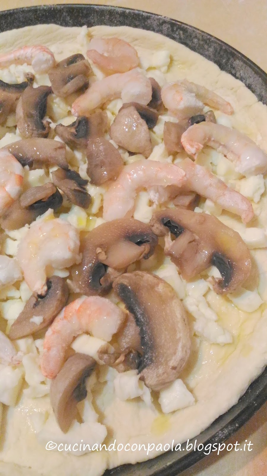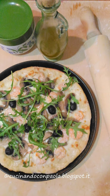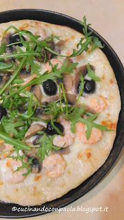 Sul piano di lavoro infarinato andiamo a stendere le pizze piuttosto sottili. Pulite i funghi, eliminate la parte finale terrosa del gambo e spellateli. Sgusciate i gamberi e apriteli in 2 parti sul dorso eliminando il filamento nero. tagliate la mozzarella a dadini (per me il Cubettato pronto), lavate la rucola, asciugatela su carta assorbente e tagliatela grossolanamente al coltello.