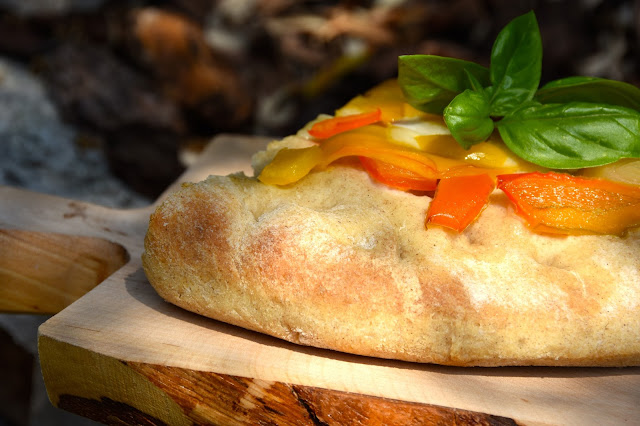 Ho usato della farina di ceci germinati per lo spolvero e della farina di tipo 1 macinata a pietra per l’impasto. Il condimento? A piacimento! Io ho usato dei peperoni gialli e rossi (cotti a parte e non in forno con l’impasto), mozzarella e basilico fresco.