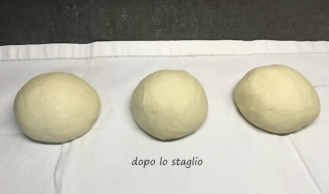 Trascorse le 2 ore, procedere con lo staglio a mano, cioè con la divisione del panetto in 3 o 4 palline dello stesso peso (tra 180 e 250 g). Io ne ho fatte 3.