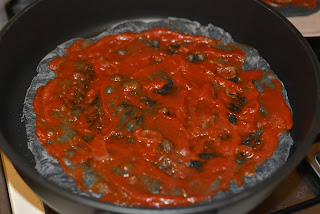 Procedete quindi con la cottura: mettete la base nella padella ben calda e copritela col sugo di pomodoro.