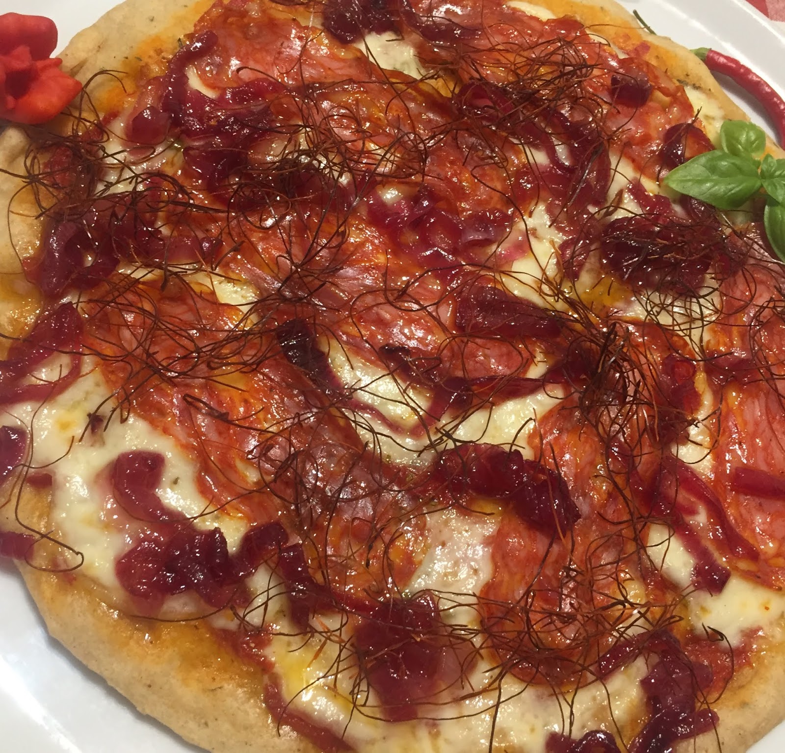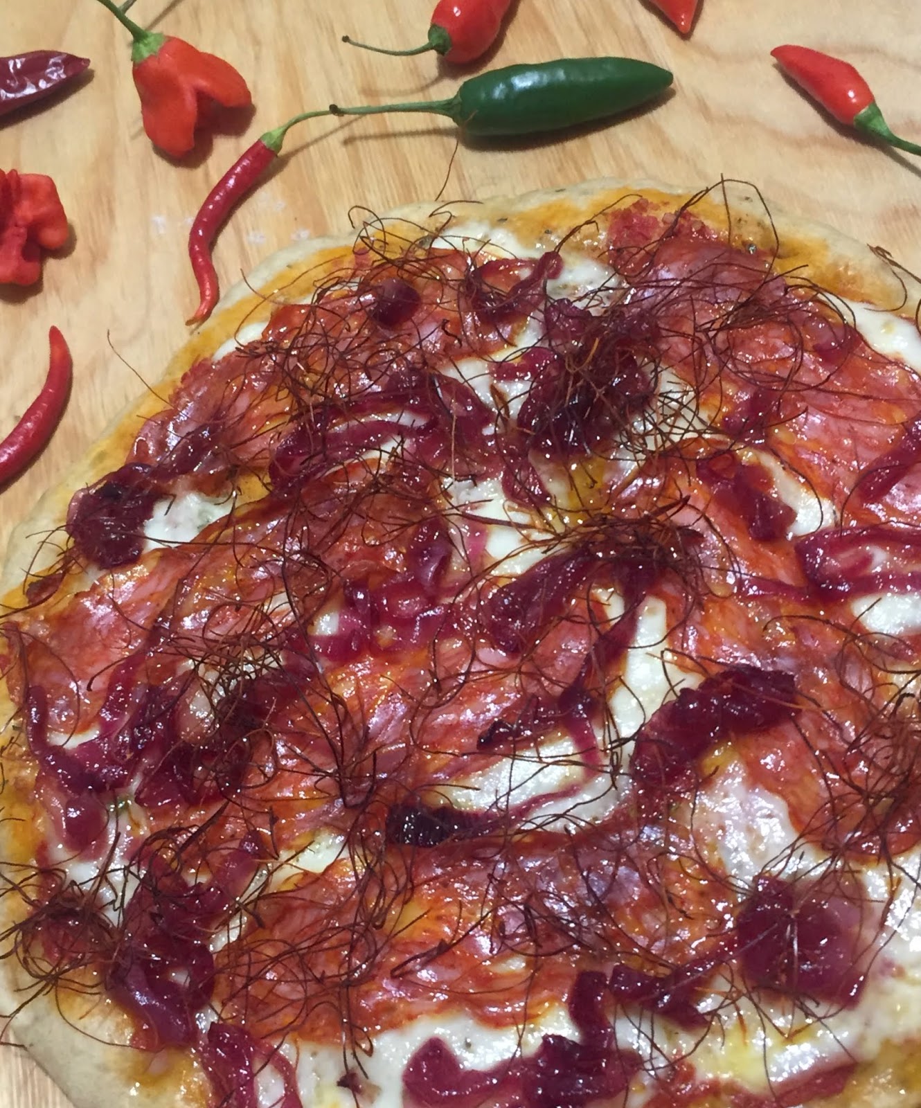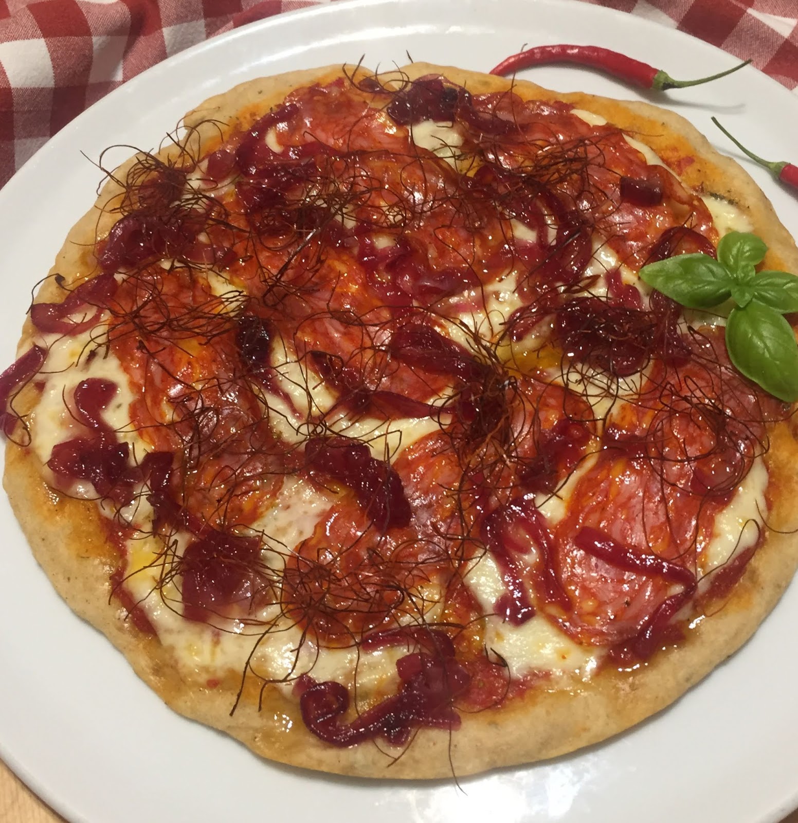 In realtà per il colore rosso vivo oltre che per il gusto avrei dovuto chiamarla “alla diavola”, “inferno” o pizza calabresa come la chiamano fuori dall’Italia, i nostri peperoncini infatti sono incendiari, adatti ai palati forti e coraggiosi.