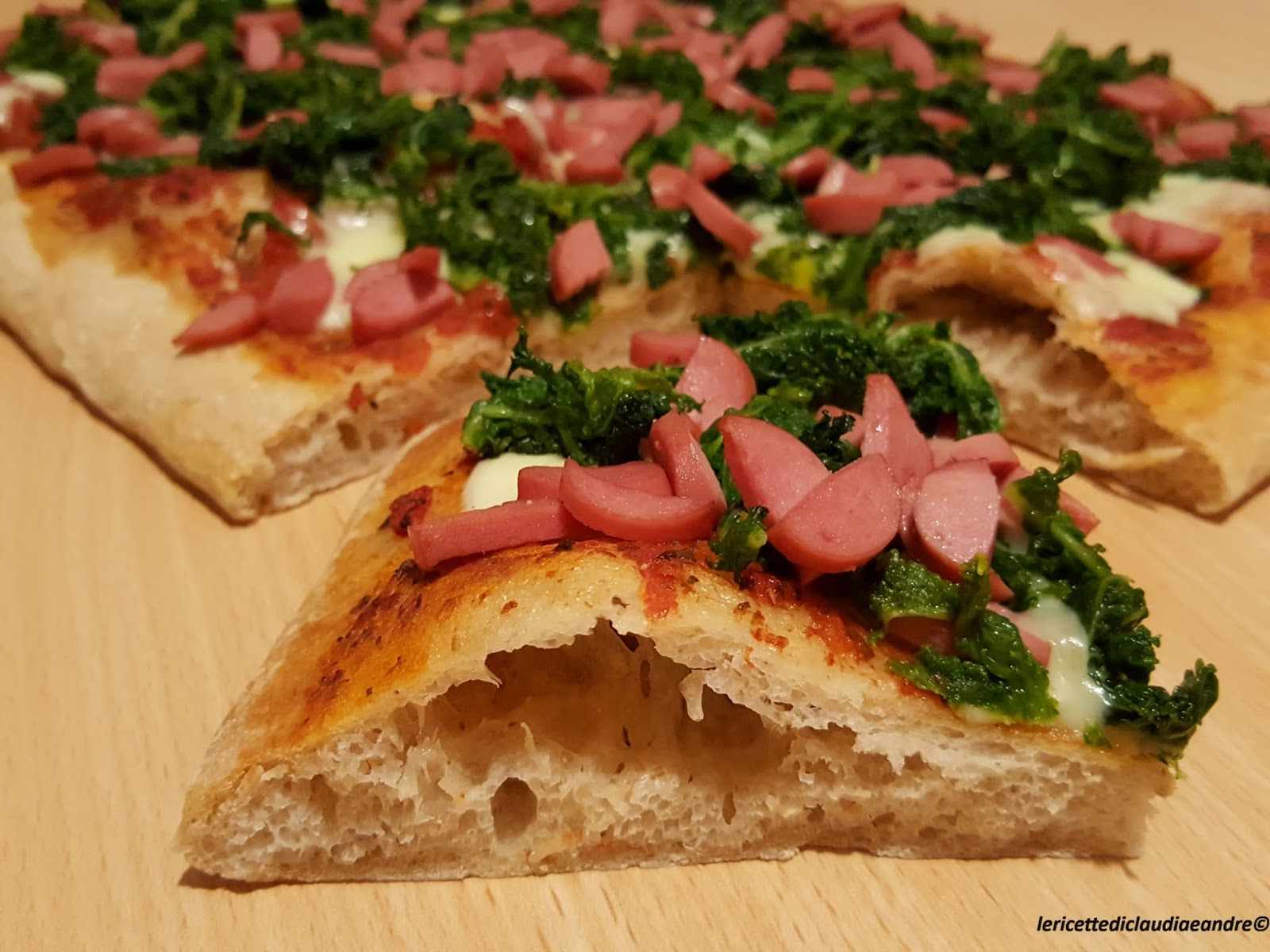 Pizza semintegrale con cime di rapa, wurstel, fontina e lievito madre