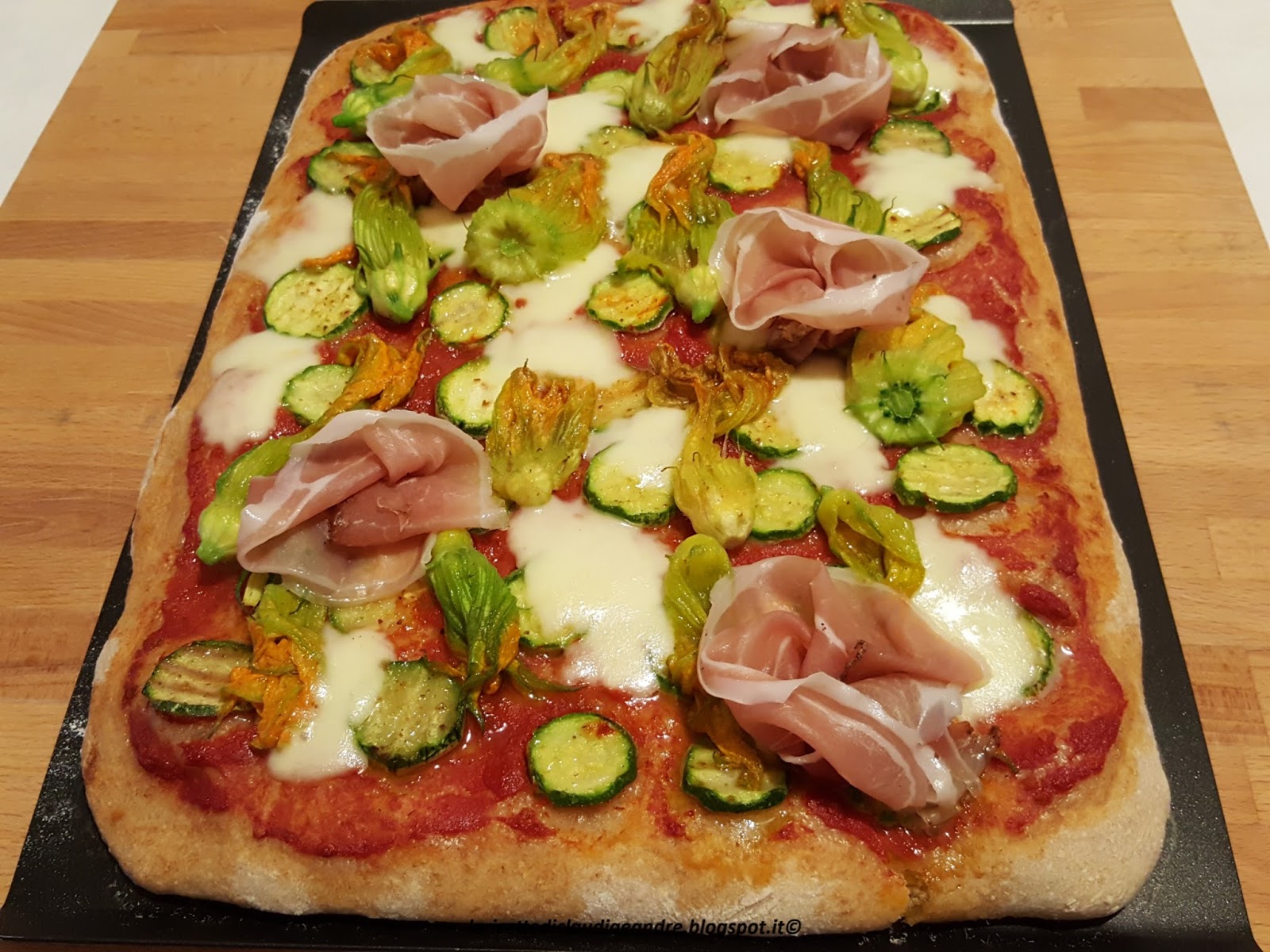 Pizza semintegrale con fiori di zucca, mozzarella, speck e lievito madre