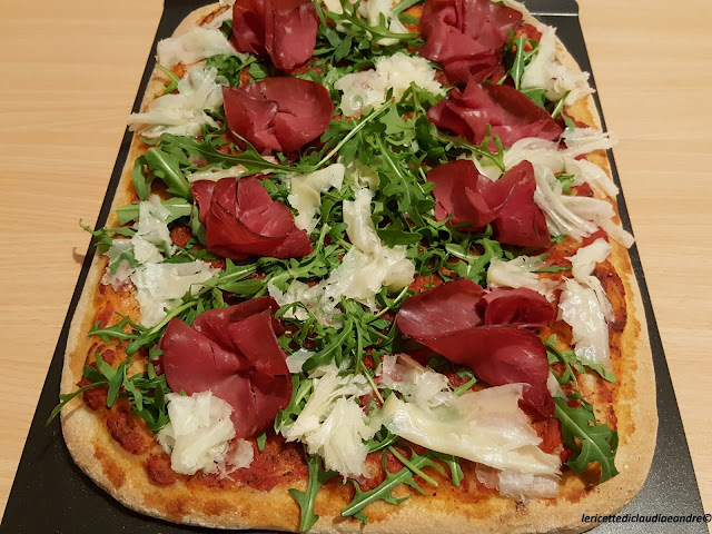 - Togliere la teglia dal forno, distribuire sopra la rucola, la bresaola e la raspadura e servire.