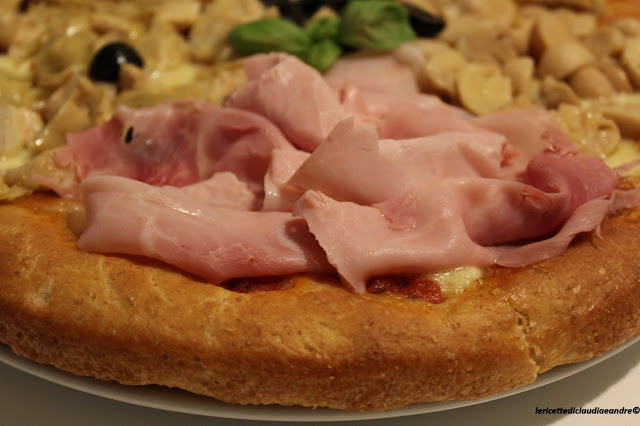 - Sfornare, distribuire sopra anche le olive, il prosciutto, i funghetti e i carciofini e servire !