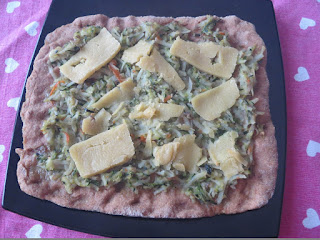Nel frattempo tagliare a fiammifero le verdure. Imbiondire un po’ di cipolla in padella con un filo d’olio, aggiungere le verdure ed un po’ d’acqua. Portare a cottura completa aggiungendo un po’ d’acqua, salare. Distribuire le verdure sulle pizze, affettare il formaggio e distribuirlo sulle pizze.
