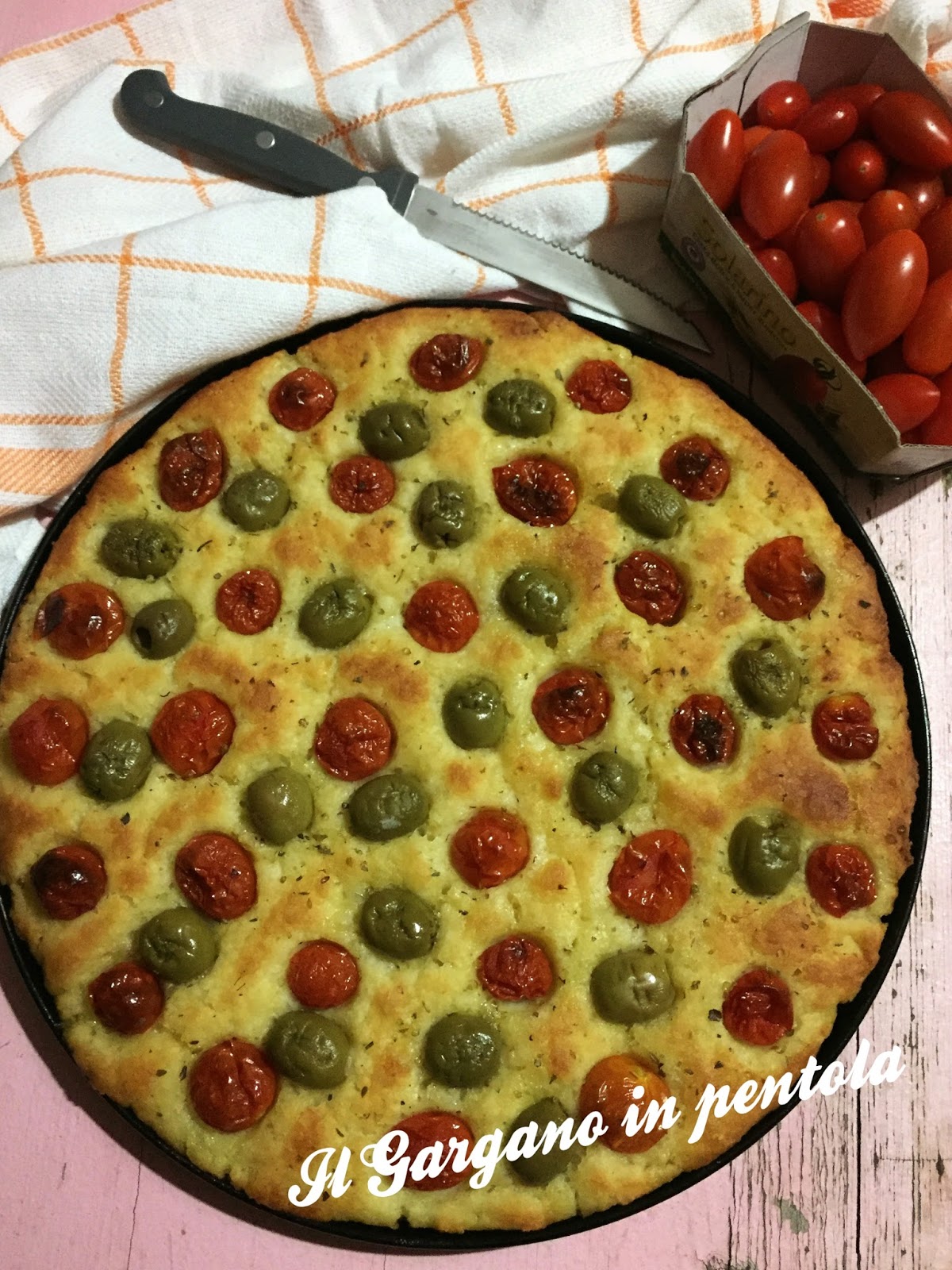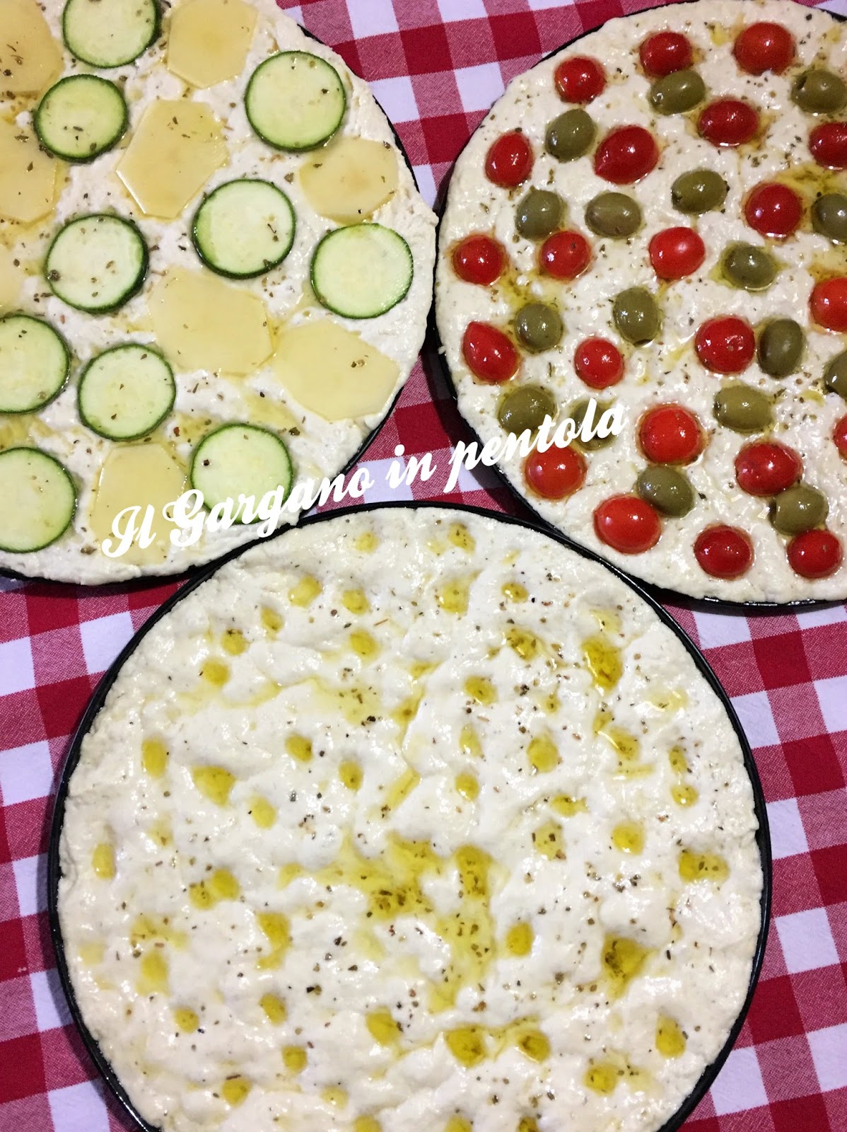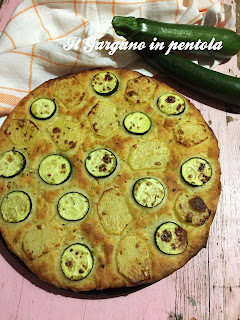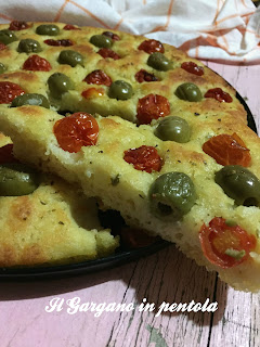 La focaccia classica prevede come condimento i pomodorini e le olive, oltre a quella io ne ho fatte altre 2, una bianca che ho farcito poi con la mortadella, e una con patate e zucchine