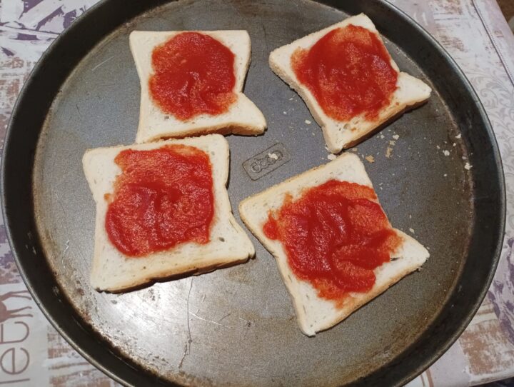 Mettere su ogni fetta di pancarrè un cucchiaio raso di passata di pomodoro, uno strato di mozzarella e una spolverata di origano.