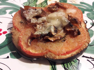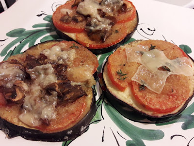 Affettare piuttosto sottili i pomodori e disporli sulle fette di melanzana, salare leggermente anch’essi, spolverizzarli con timo oppure origano e con poco pangrattato; distribuirvi sopra un po’ di funghi cotti e un filo d’olio. Cuocere le “pizzette” in forno a 180-190° per circa 15 minuti, poi aggiungervi sopra le scagliette di grana oppure la mozzarella tagliata a dadini e proseguire la cottura in forno per altri 5 minuti. Servirle calde ma non bollenti.