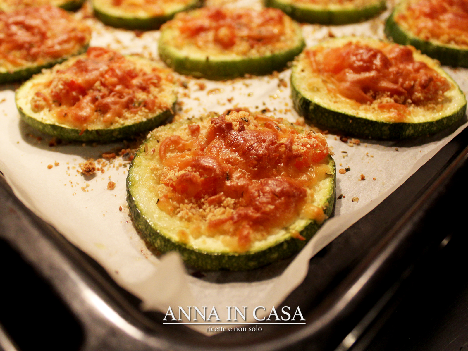 Su ogni dischetto disporre dadini di pomodoro, asiago grattugiato (o altro formaggio a pasta dura). Cospargere con un mix di  cucchiai di parmigiano grattugiato,  cucchiaio di pangrattato, sale e origano.