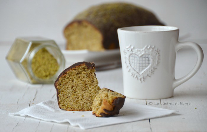 In una ciotola mescolate insieme le uova leggermente sbattute, il latte, l’essenza di vaniglia e l’olio. A questo punto unite, sempre mescolando con una frusta a mano, la farina setacciata con il lievito e lo zucchero. Quando il composto sarà ben amalgamato, con l’ausilio di una spatola in silicone aggiungete i pistacchi tritati finemente e fate in modo che si amalgamino bene al composto. Versate il tutto in uno stampo da plum cake rivestito di carta forno ed infornate a 180° in modalità statica per 30/40 minuti circa. Fate raffreddare su una gratella per dolci. Nel frattempo preparate la copertura, facendo sciogliere a bagnomaria la cioccolata spezzettata, stando molto attenti che l’acqua non arrivi mai a bollore, appena la cioccolata sarà ben fluida, versatela sul dolce e guarnite cospargendo con un trito di pistacchi. Lasciate che la colata di cioccolata si solidifichi prima di servire il dolce. Lo potrete conservare sotto la classica campana di vetro, rimarrà sofficissimo per tre/quatro giorni…oltre non è sopravvissuto!