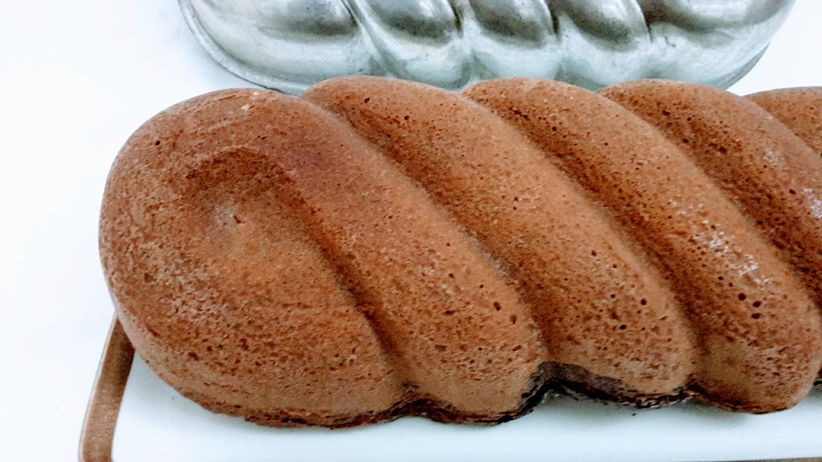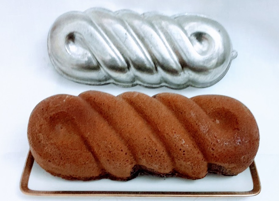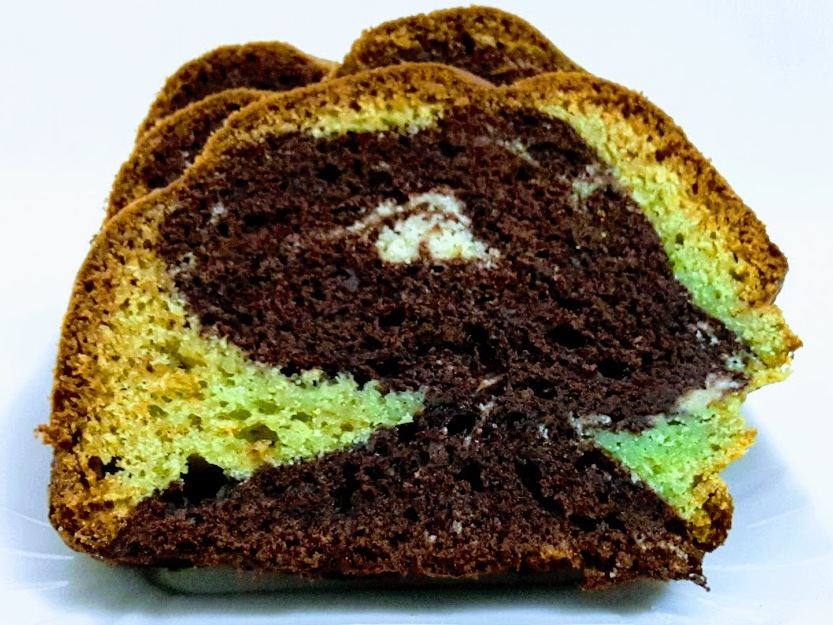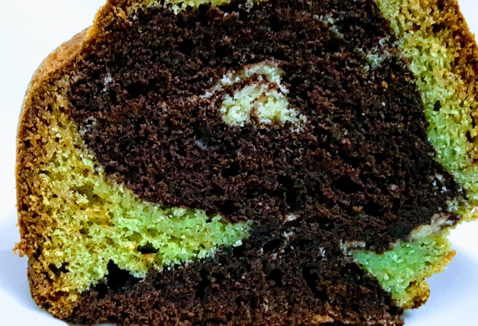 Imburrare ed infarinare con cura uno stampo da plum cake e versare una parte della massa verde alterandola con quella al cacao..