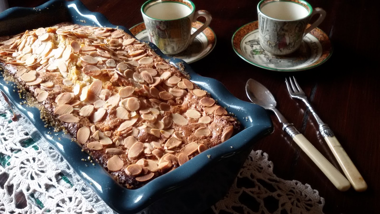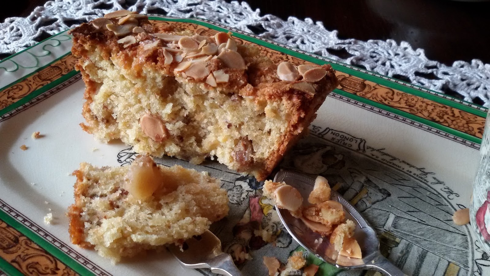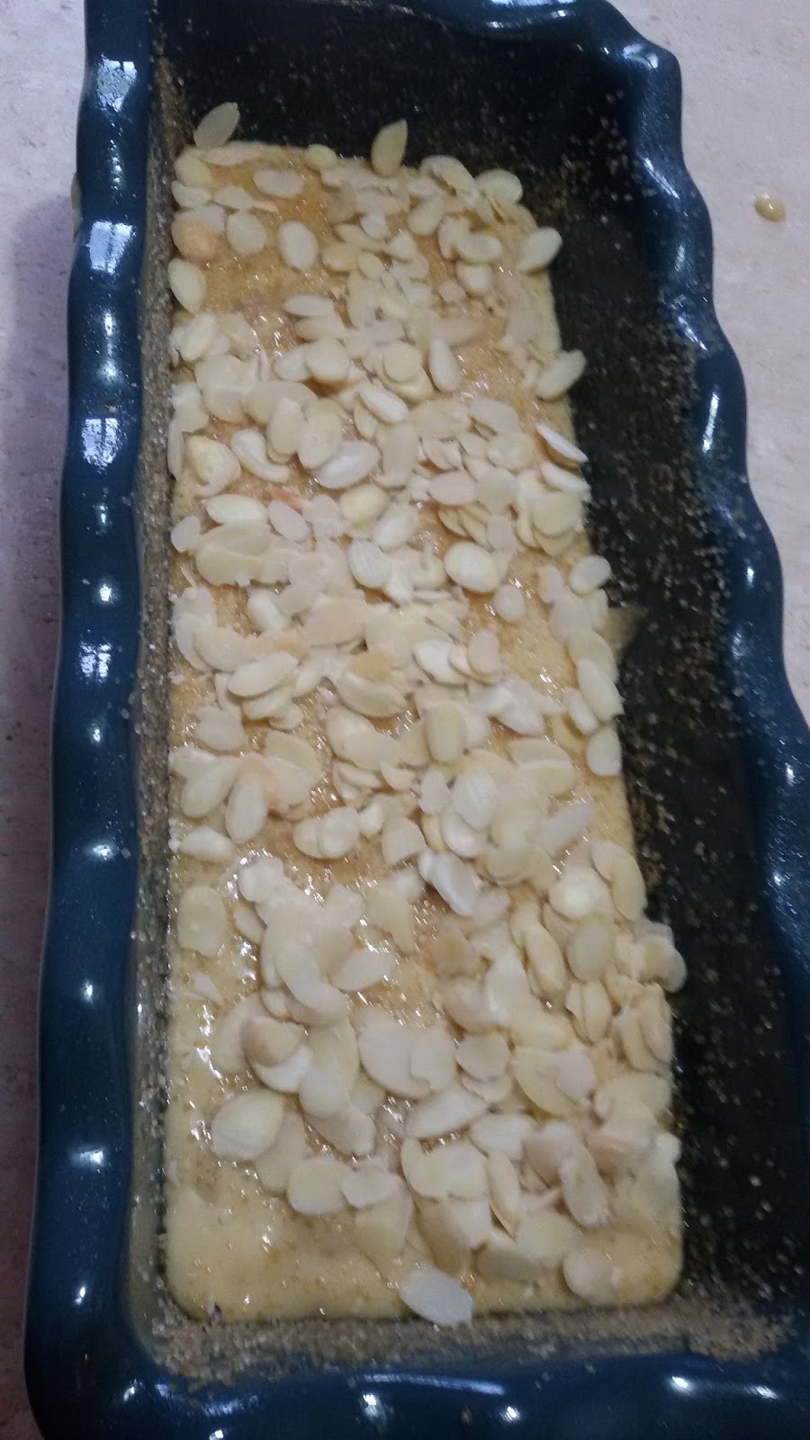 Ho fatto qualche modifica, utilizzando lo zucchero di canna, che adoro in questo tipo di dolci, ho aggiunto un po’ di latte, perchè il composto mi sembrava troppo asciutto e ho messo sulla superficie tante tantissime mandorle a scaglie . . . lo sapete che ho un debole per il croccantino che viene sulla superficie . . .