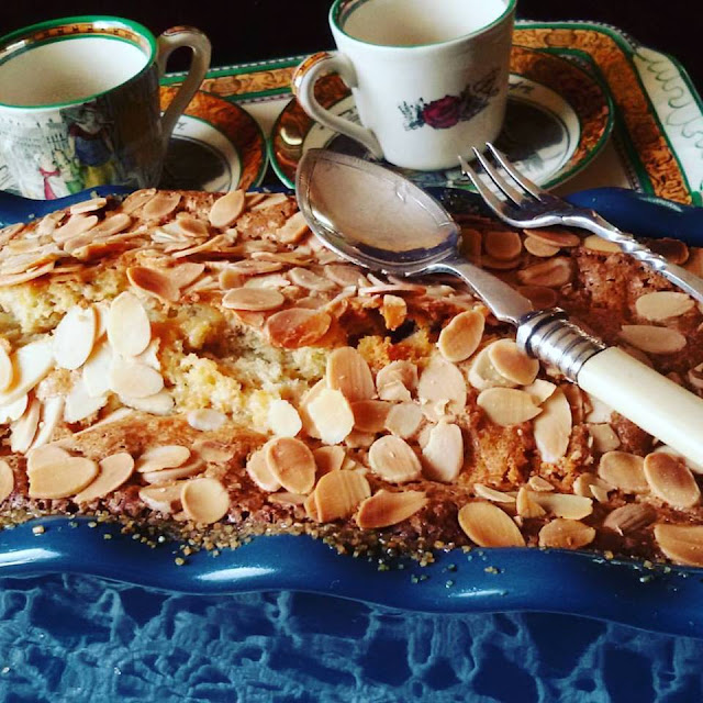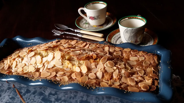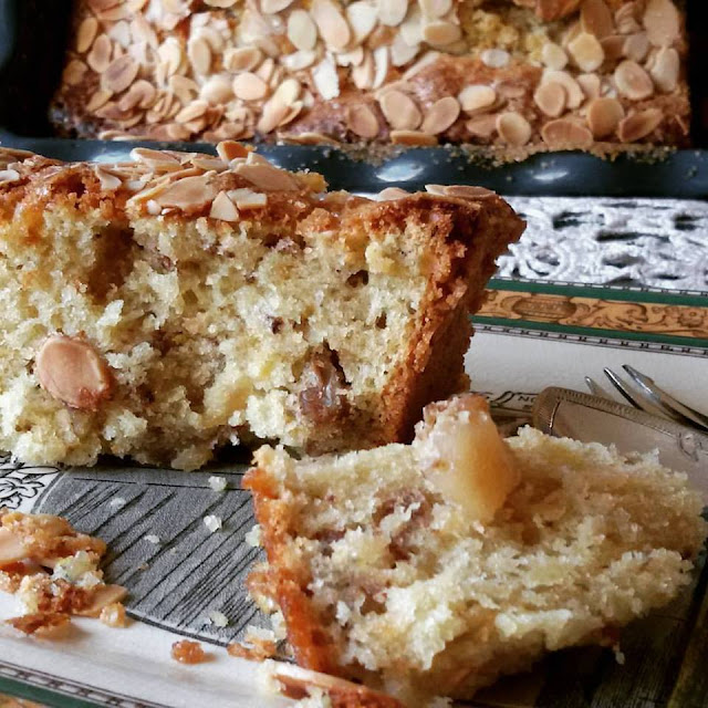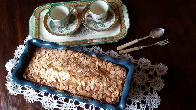 Ho fatto qualche modifica, utilizzando lo zucchero di canna, che adoro in questo tipo di dolci, ho aggiunto un po’ di latte, perchè il composto mi sembrava troppo asciutto e ho messo sulla superficie tante tantissime mandorle a scaglie . . . lo sapete che ho un debole per il croccantino che viene sulla superficie . . .