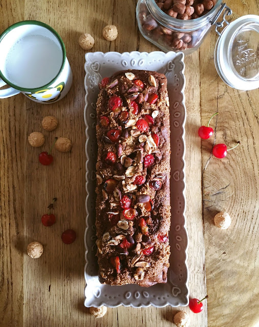Questo plumcake racchiude alcuni dei miei sapori preferiti: gli amaretti, le amarene (che amo follemente), le nocciole, con una base di cacao amaro.