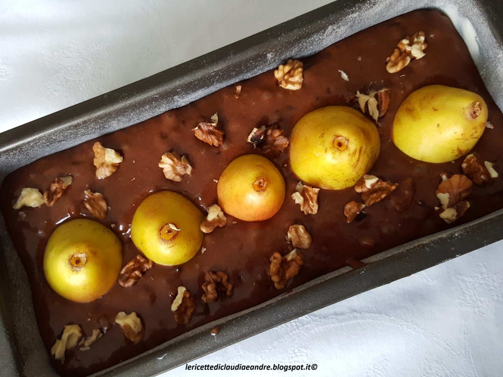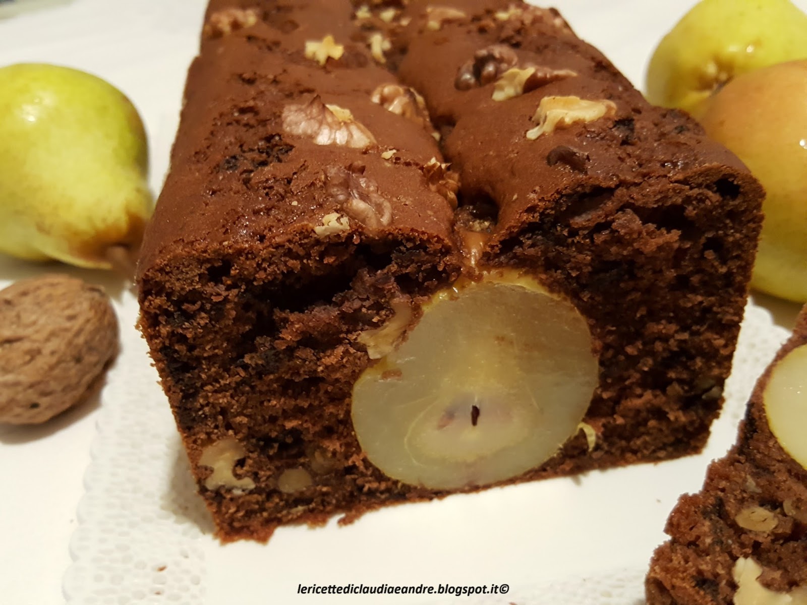 Una delizia per gli occhi e per il palato, l’abbiamo quasi divorata ancora tiepida, provare per credere. Come spunto ho preso una mia vecchia ricetta di “Muffin con pere, cioccolato e noci, al miele“ facendo delle modifiche e trasformandolo nella versione cioccolatosa. Ho aggiunto sopra i gherigli di altri 2 noci e l’ha arricchito molto. Avevo rimaste ancora 6 pere e li immaginavo dentro ogni volta che passavo vicino e non ho resistito nel mettere in pratica. Ecco a voi la ricetta !