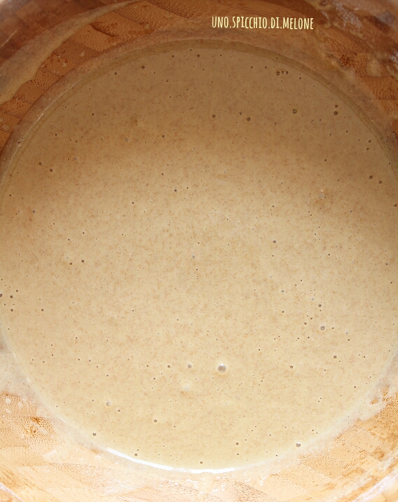Il composto del plumcake risulterà semi liquido ed omogeneo. E’ bruno poiché avete utilizzato la farina e lo zucchero integrale.