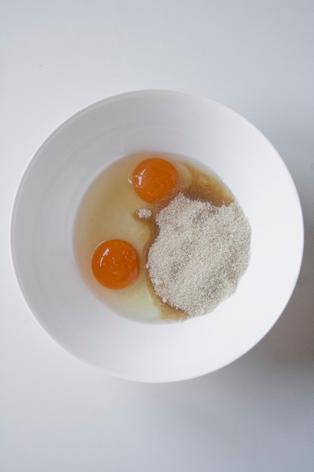 In una ciotola capiente unite le 2 uova intere e lo zucchero di canna e lavorate il tutto con le fruste elettriche fino ad ottenere un composto spumoso e chiaro.