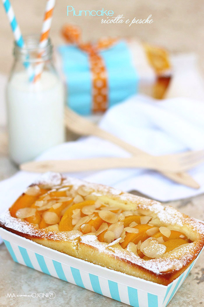 distribuite sulla superficie degli spicchi di pesca sciroppata e dei filetti di mandorle.