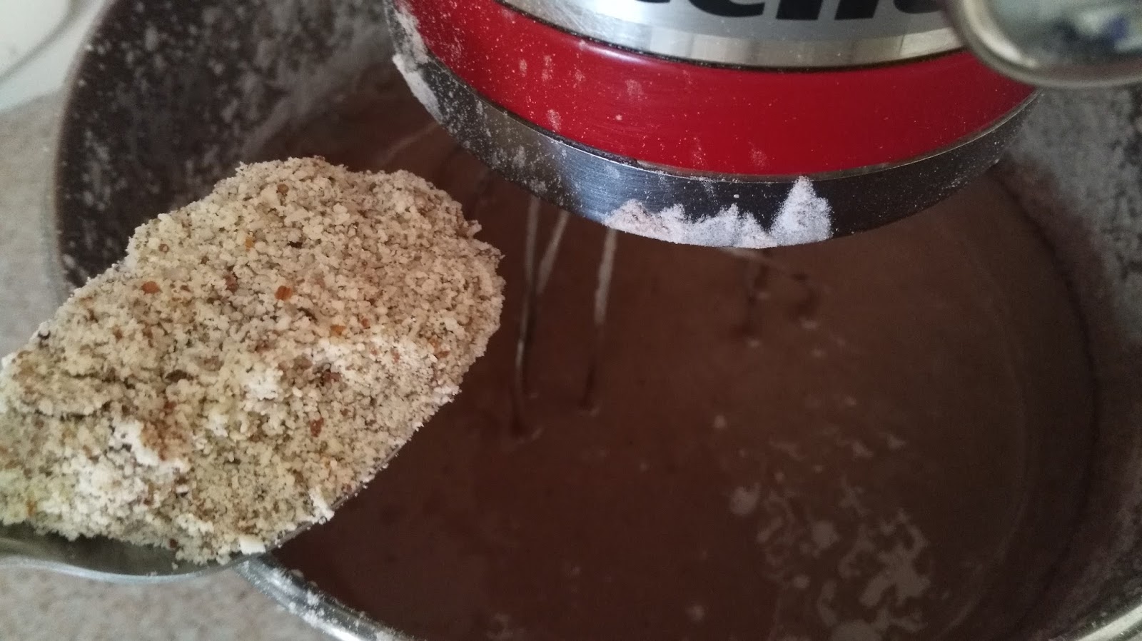 Aggiungete delicatamente a filo l’olio ed il latte di mandorla sempre mescolando con la frusta. Setacciate farina, cacao e lievito. Unite le polveri pian piano al composto sempre mescolando però delicatamente. Unite le mandorle tritate ed amalgamate bene.