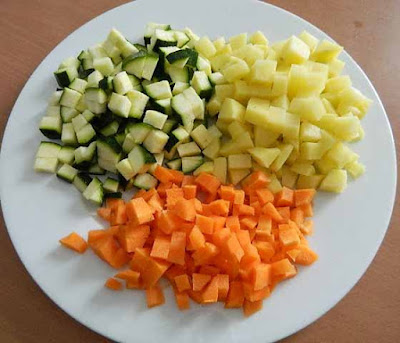 Lavare, pelare, tagliare a dadini tutte le verdure e mettere da parte.