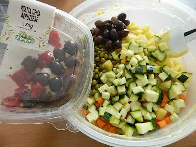 aggiungere le verdure messe da parte, le Olive Nere, i piselli e la provola,