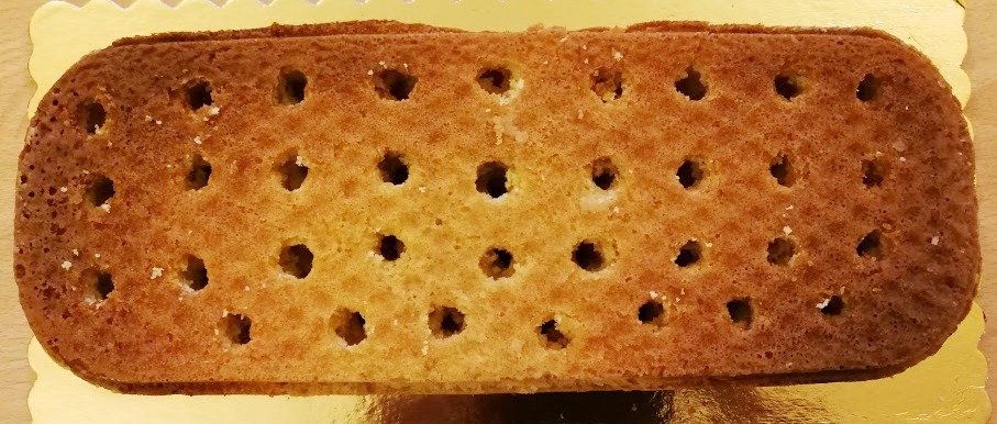 Far raffreddare il dolce, trasferirlo su un piatto da portata quindi con il manico di un cucchiaio di legno praticare dei fori sulla superficie.