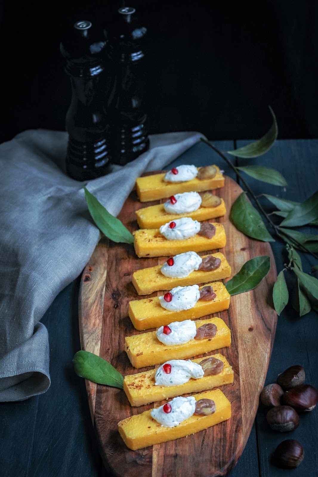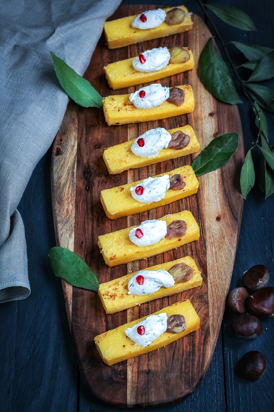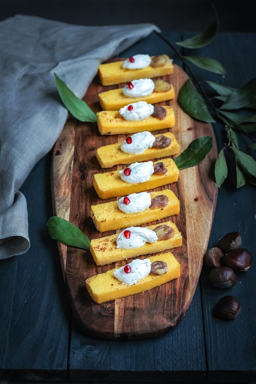 Tagliate la polenta in strisce e farcitela con una quenelle (un cucchiaino) di mix di formaggi, castagne cotte e chicchi di melagrana.