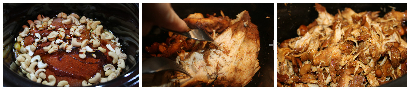 inserite il petto di pollo nella pentola, conditelo con l’olio e tutte le spezie e salse, aggiungete gli anacardi, richiudere il coperchio e fate cuocere per 4 ore a temperatura alta, oppure 6 ore a quella bassa. Una volta pronto sfilettare la carne con una forchetta e servite caldo.
