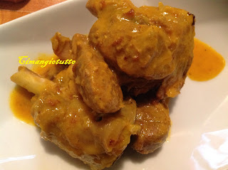 Tagliare a pezzi il pollo e passarlo nel curry, schiacciandolo bene. Lasciarlo riposare per circa mezz’ora.