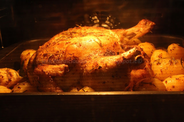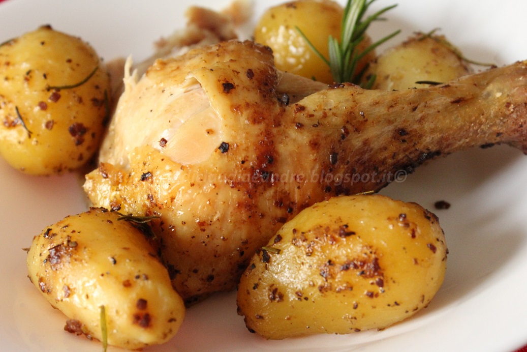 Mettere dentro un rametto di rosmarino e una foglia di alloro e collocare il pollo in una teglia dai bordi alti, unta in precedenza con del olio. Cuocere nel forno preriscaldato a 200 ° per circa 30 minuti, girare il pollo e proseguire la cottura per altri 60 minuti. Se dovesse scurire troppo, mettere sopra un foglio di alluminio alimentare. Nel frattempo insaporire le patate con del brodo granulare vegetale o in mancanza con del sale, con un pò di pepe, aghi di rosmarino, l’altra foglia di alloro spezzata in due, una girata abbondante di olio e mescolare bene per amalgamare. Trascorso il tempo, tirare la teglia fuori, distribuire le patate tutto attorno al pollo e proseguire la cottura per un altra mezz’ora. Una volta pronto, portare in tavola e servire.