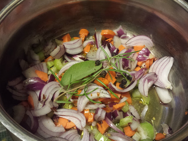 - in un tegame versare 1\2 bicchiere di olio d’oliva e aggiungere tutte le verdure , rosolare bene aggiungendo qualche foglia di salvia, qualche foglia d’alloro, 4 bacche di ginepro