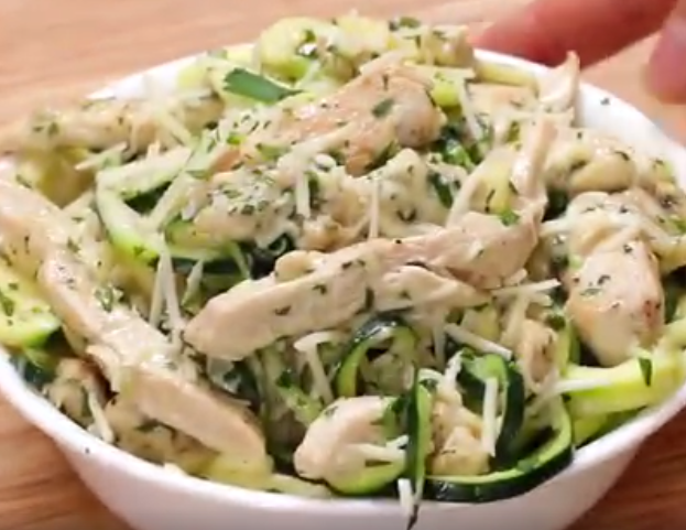 INGREDIENTI 3 zucchine, le estremità tagliate 2 cucchiai. burro 2 petti di pollo a fette sottili, 1 cucchiaino di sale 1 cucchiaino di pepe nero macinato fresco 3 spicchi d’aglio, tritati ¾ tazza di panna 1 tazza di parmigiano tagliuzzato 2 cucchiai di prezzemolo tritato PREPARAZIONE Utilizzando un spiralizer, spiralize le zucchine a tagliatelle sottili. Mettete le zucchine nel Microonde le tagliatelle per due minuti, poi scolare il liquido. Sciogliere il burro in una padella a fuoco medio. Cuocere il pollo, sale, pepe e aglio fino a quando l’aglio comincia a marrone e il pollo è cotto. Aggiungere la panna, il parmigiano, il prezzemolo e, mescolando uniformemente . Portare a ebollizione, quindi mescolare fino a quando la salsa si è ridotto di circa la metà. Togliere dal fuoco. unire le tagliatelle zucchine con il composto di pollo, e mescolare fino a quando saranno rivestite in modo uniforme. Servire con più parmigiano, se desiderate!