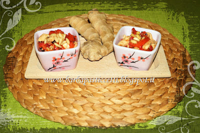 Ridurre il petto di pollo in piccoli bocconcini e versarlo in una padella antiaderente con olio di semi di girasole, far cuocere e poco prima di spegnere la fiamma, aggiungervi i pinoli, i peperoni, una grattata di zenzero fresco e la soia.