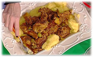 Far cuocere la polenta lentamente… Condire i pezzetti di pollo con sale e pepe. Mettere in una casseruola il burro e l’olio, farlo scaldare e allinearvi i pezzetti del pollo. Lasciar colorare a fuoco vivo, (*) sgocciolare tutto il grasso possibile. Versare il brandy e infiammarlo, ridurlo quasi completamente e versarvi il vino. Lasciare ridurre il vino aggiungervi il pomodoro fatto a pezzetti, le mele affettate, le olive verdi, il curry, il tabasco, il mazzetto e qualche cucchiaiata di acqua, sale e i peperoncini. Far cuocere ancora per 25 minuti dolcemente. Disporre il pollo con guarnizione e salsetta con un paio di gnocchi di polenta.