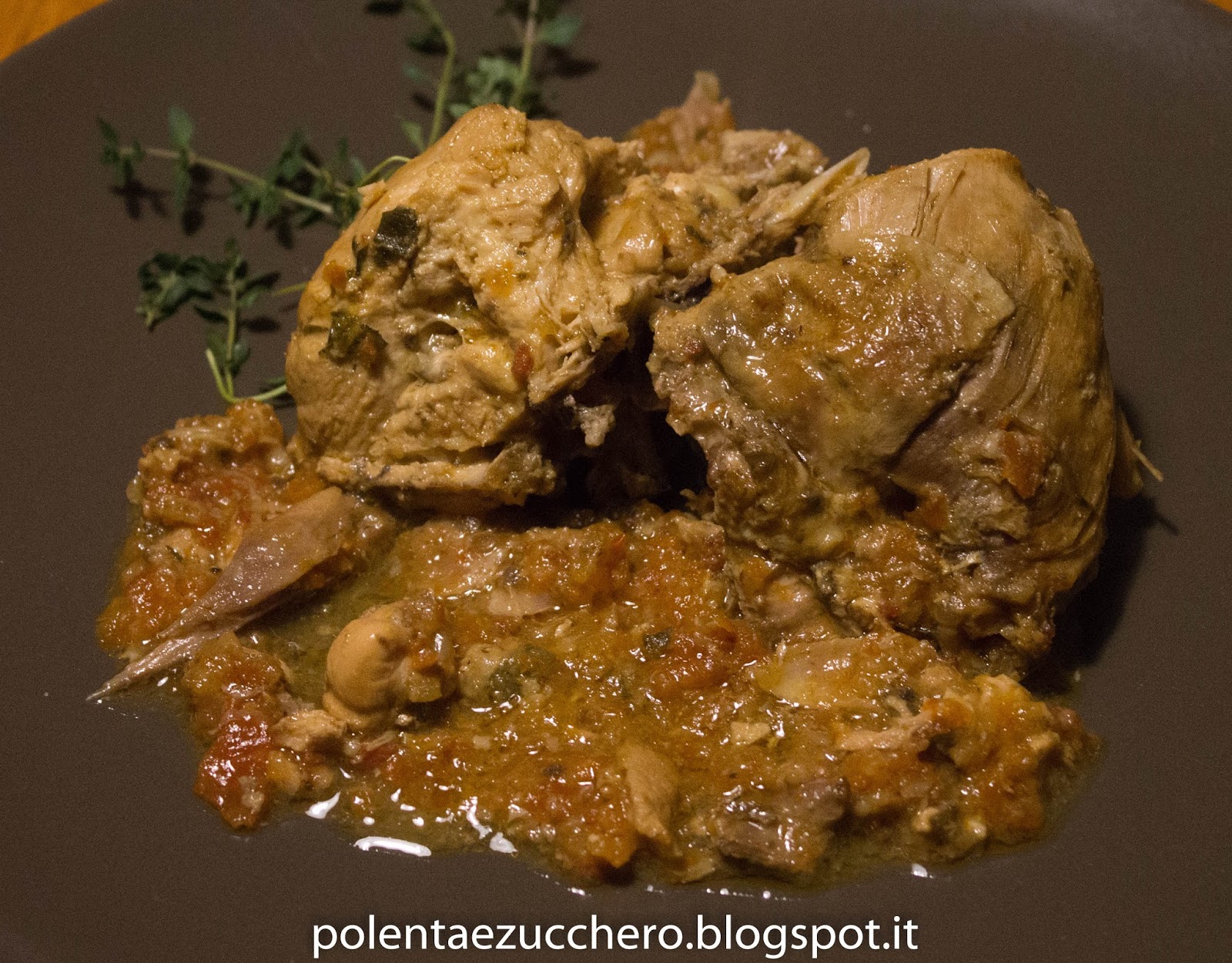 Tagliare a pezzi il pollo e lavarlo bene sotto l’acqua corrente. Preparare una casseruola con mezzo bicchiere di olio d’oliva e quando sarĂ caldo mettere il pollo e rosolarlo girandolo su tutti i lati. Sfumare con un bel bicchiere di vino bianco poi unire i pomodorini tagliati a pezzi, 5 foglie di salvia spezzettate e 2 foglie di alloro, abbassare la fiamma e cuocerlo adagio per circa mezz’ora unendo del brodo vegetale quando il fondo di cottura si asciuga troppo.