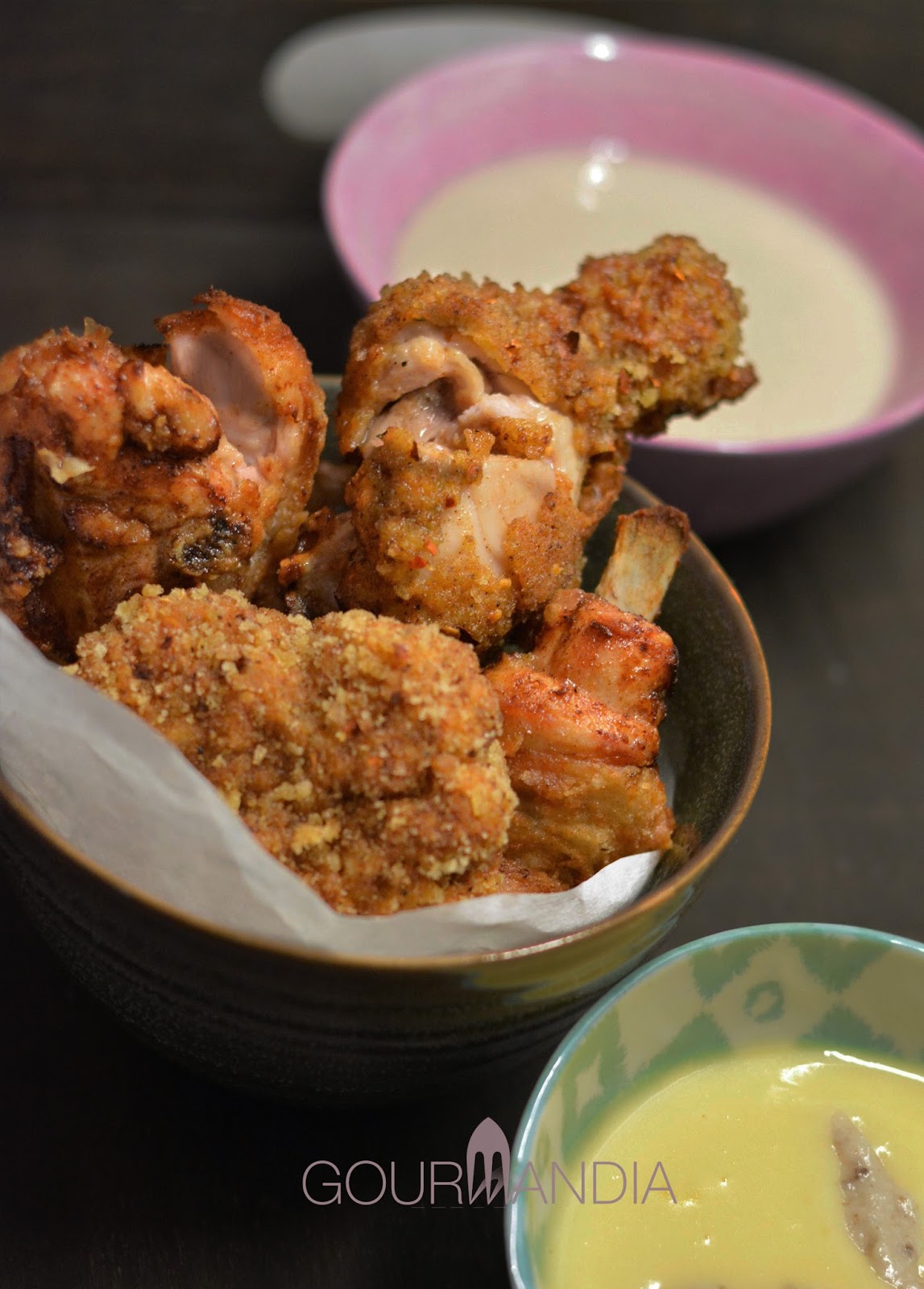 Per la seconda proposta, lasciata alla creatività personale, mi sono affidata all’immagine di pub anglosassoni sempre accoglienti, mai deserti, dove puoi trovare spesso un buon pollo fritto, panato a dovere, da accompagnare con una salsa al formaggio e un’ottima birra. Quale birra? Una Scotch Ale, densa e con sentore di caramello. Io ho scelto la “Old Parochial” (Tempest Brew Co.), la cui caratteristica è quella di essere affinata in ex botti per il bourbon e avere un leggero sapore affumicato, 10 % vol. Ne ho usata una per la marinatura.
